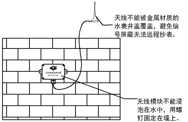 2. 模塊不能浸泡在水中,安裝時用螺釘固定在牢固墻面,引出天線不能被金屬材質的水表井覆蓋,避免信號屏蔽無法遠程抄表。